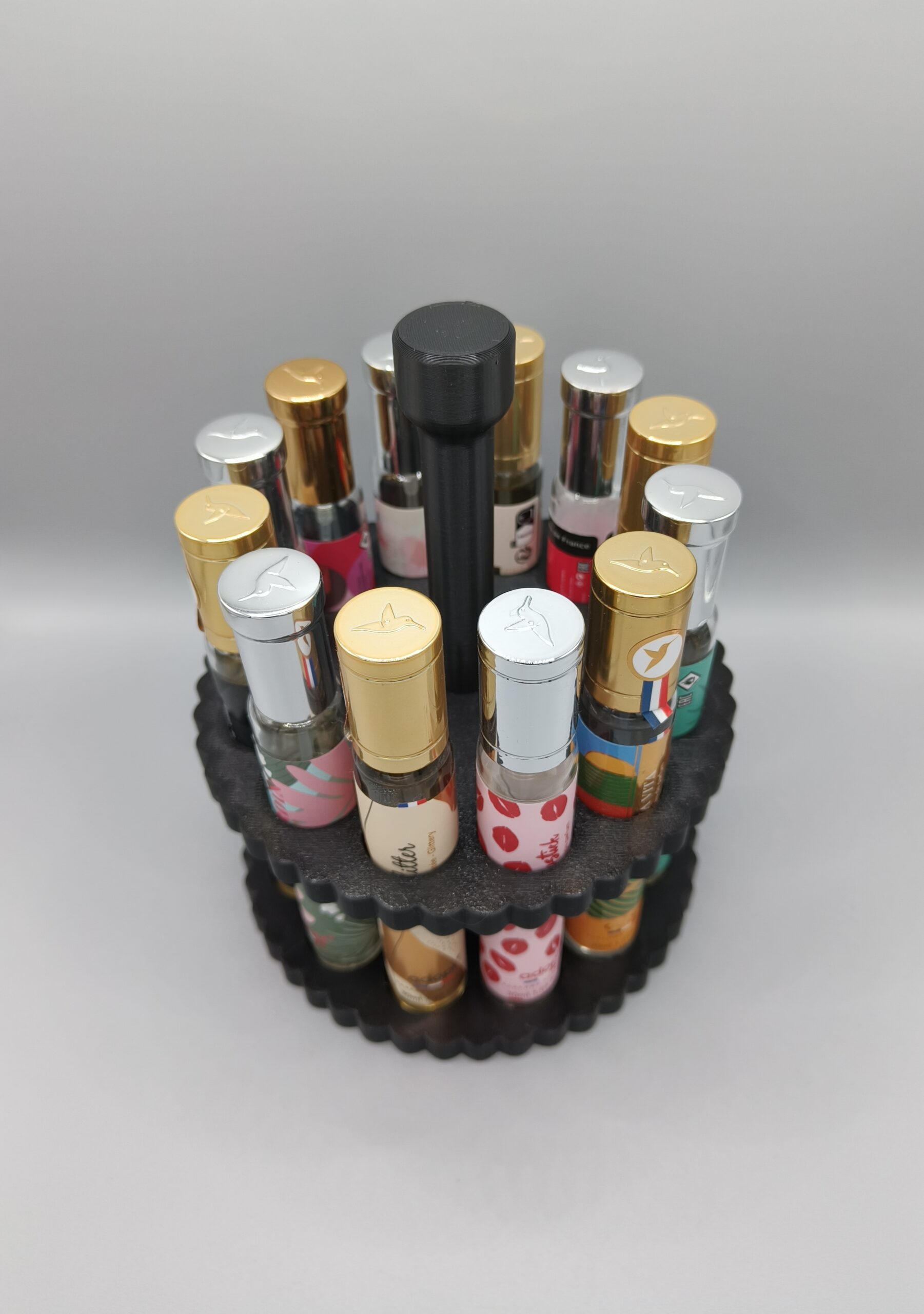 Organisez vos fragrances avec élégance grâce à ce support en forme de carrousel pour 12 parfums Adopt, mêlant style et fonctionnalité. Fabriqué artisanalement en impression 3D, ce modèle non rotatif offre un design en forme de carrousel pour ranger vos flacons avec une touche unique. Personnalisez-le avec une palette de couleurs au choix – sélectionnez celle qui vous inspire via la pastille ci-dessus. Vendu sans parfums, cet accessoire est parfait pour les amateurs de senteurs Adopt cherchant un rangement original.