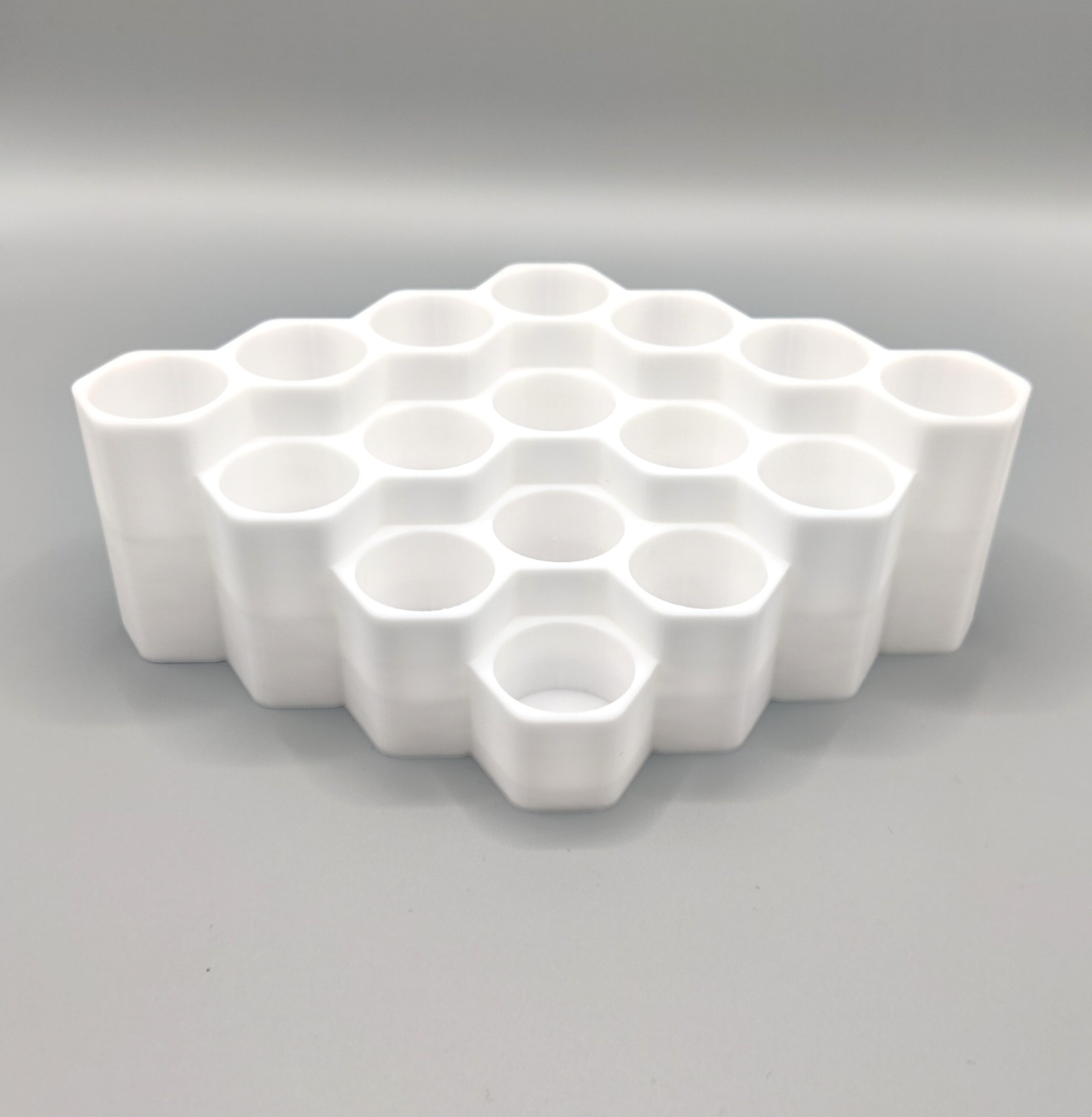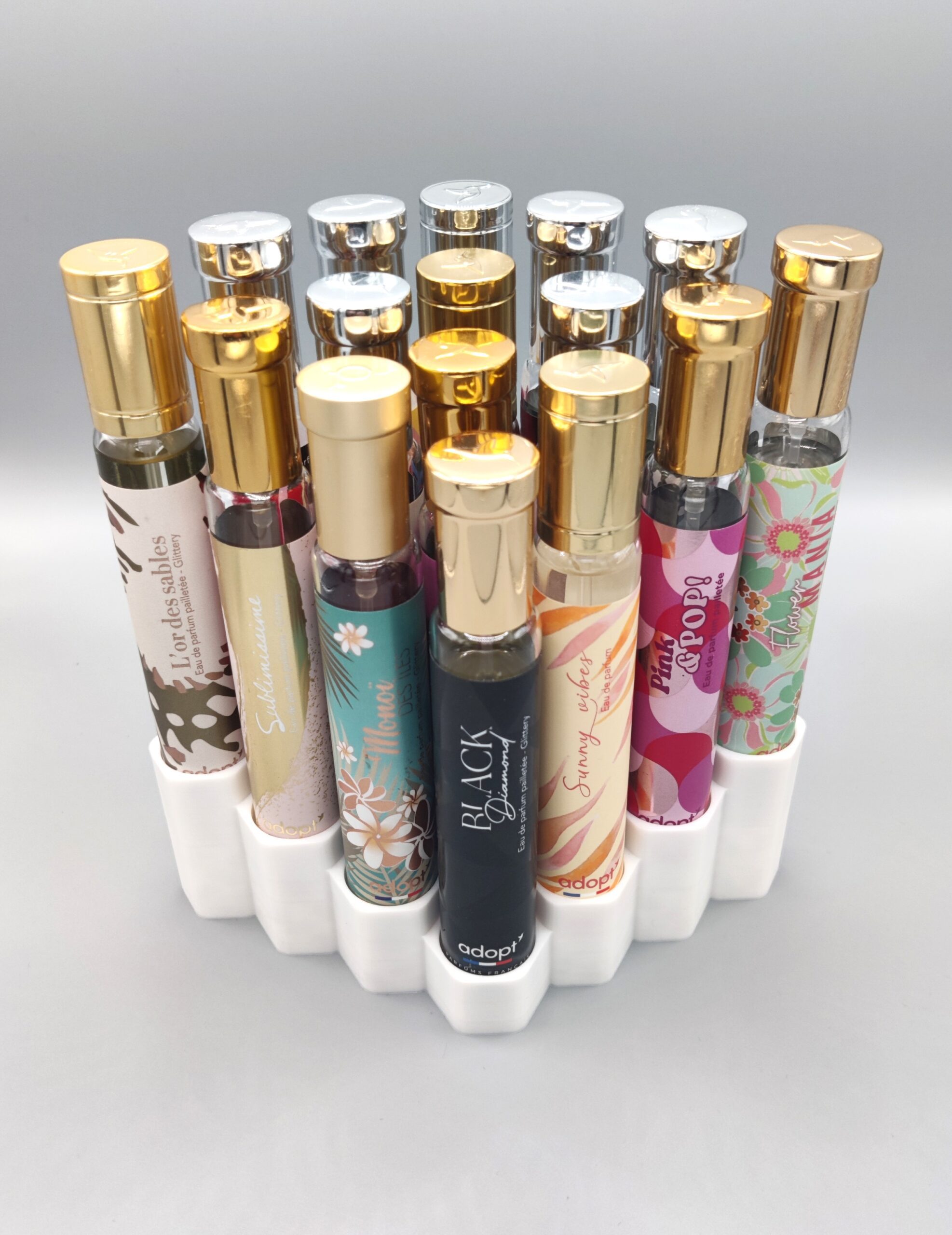 Apportez une touche de sophistication et d’organisation à votre espace avec ce support pour parfums type Adopt (30 ml), conçu en forme de nid d’abeille. Fabriqué artisanalement en impression 3D, il offre un style unique avec 16 emplacements pour vos flacons préférés. Vendu sans parfums, c’est l’accessoire idéal pour les amateurs d’Adopt. Cliquez sur la pastille ci-dessus pour choisir votre couleur.